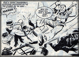 In "Valiant", Captain Hercules Hurricane, the "Ragin' Fury" of that ilk! No doubt about it, I loved that man, a pure racist, he DID -NOT -LIKE - STINKING - KRAUTS - OR - PIANO-TOOTHED WEEVIL- LEMON-COLOURED-CLOWNS upsetting his very British war victories. Even more so, I loved his batman, wee Maggot Malone, surely the purest of pure Cockneys and certainly a match for big 'Herc'! I didn't invent this script, it had been running for three or four years before I took it over in 1965. I shared the script-writing for a couple of years with an IPC staff writer called Desmond Pride and it was always a major part of my life, a very difficult job indeed. Fortunately it was made easier by the enthusiasm of long-standing editors Sidney Bicknell and Jack le Grand, both of whom I liked and admired for their professionalism and good "comic" sense of humour. I wrote Captain Hurricane for more than ten years, from 1965 to 1976. It was always drawn by an artist called ROY LANCE, whom I never met but lived in Spain. His artwork was handled by the Temple Art Agency, two really nice blokes called Pat and Danny Kelleher. |